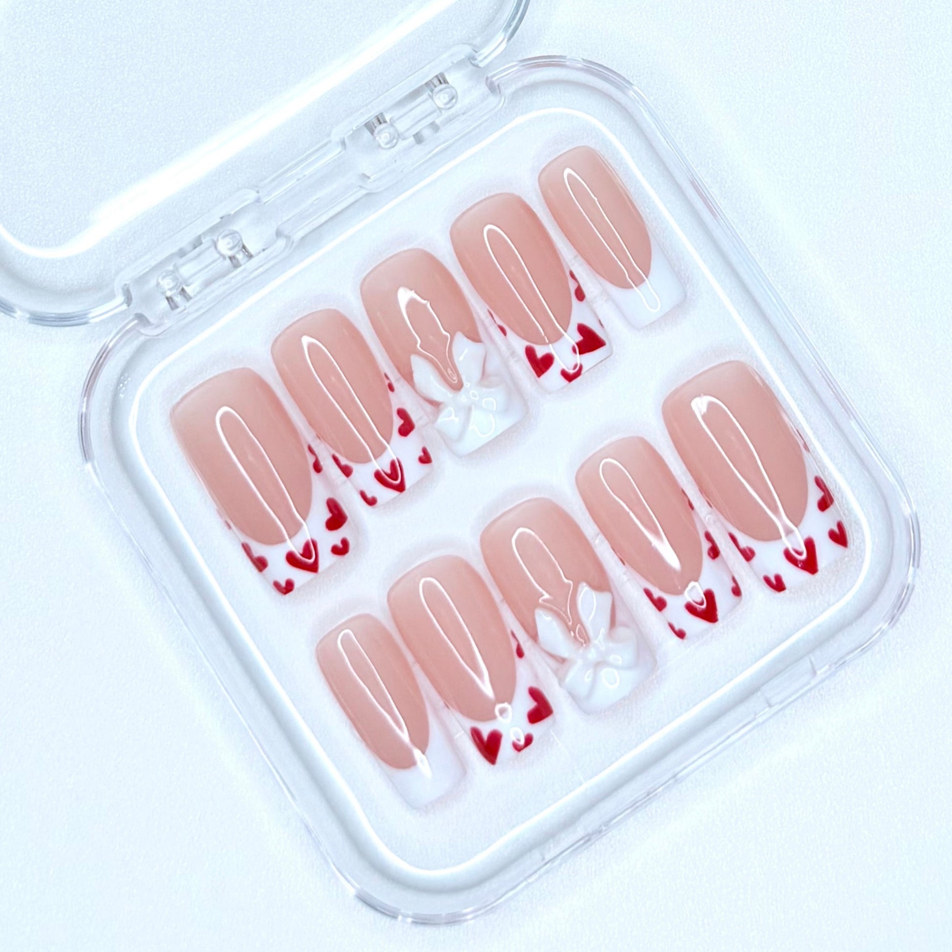 Introducing Bow & Heart, our exclusive press-on nail set available in almond, square, coffin & stiletto shapes. This soft, romantic design features a nude base with crisp white French tips, delicate red heart accents, and a statement white bow, offering boutique elegance for nails that want a sweet, modern look.