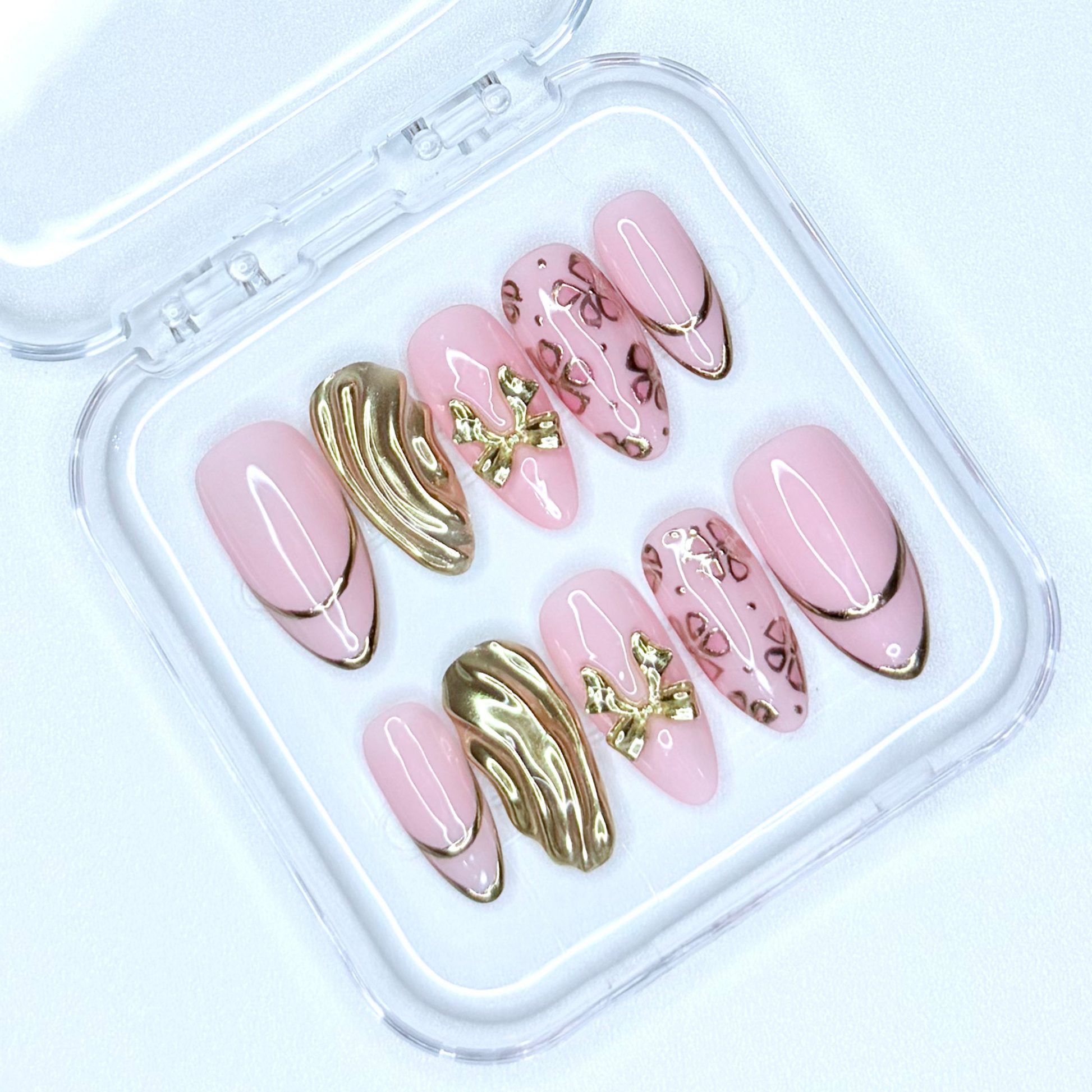Introducing Golden Petals, our exclusive press-on nail set designed for almond, square, coffin & stiletto shapes. This romantic design features a soft baby pink base with luxurious gold chrome accents, 3D swirls, a gold bow, and blooming pink flowers outlined in gold, offering feminine, luxe boutique sophistication.